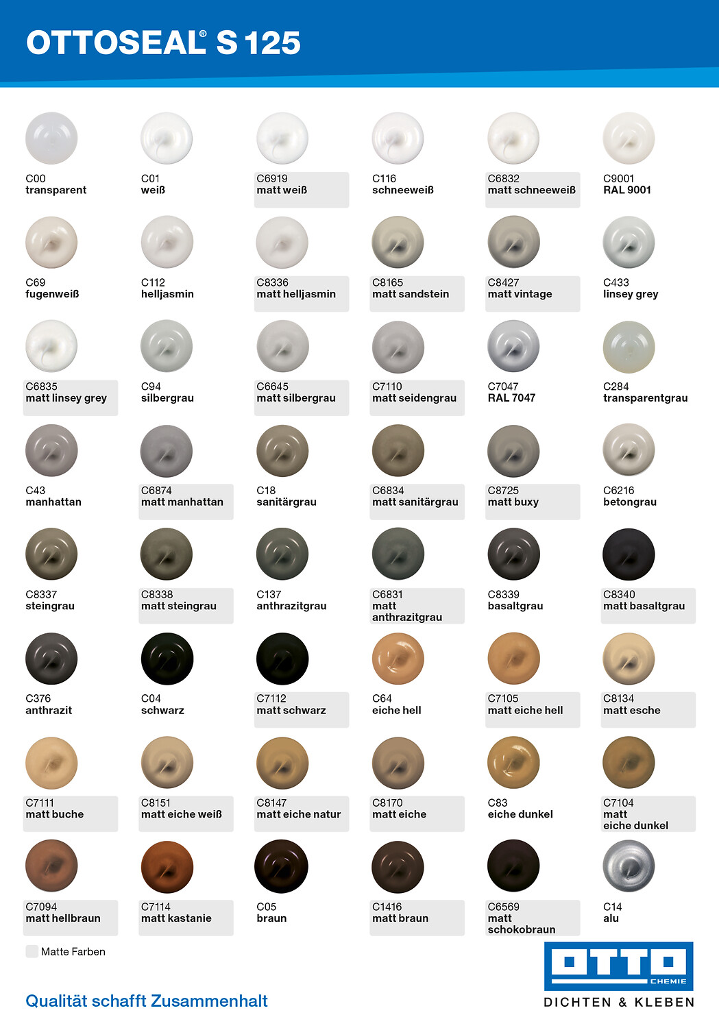 Das geruchsarme Boden- und Sanitär-Silikon OTTOSEAL® S 125 ist für verschiedene Anwendungen im Innen- und Außenbereich bestens geeignet. Sowohl bei Boden- und Anschlussfugen an Kunststoff- und Designbodenbelägen aus Gummi, Linoleum, Vinyl und PVC, als auch bei verschiedenen Anschlussfugen im Sanitärbereich, lassen sich mit OTTOSEAL® S 125 langlebige, schimmelbeständige Abdichtungen durchführen. Durch seine Verfügbarkeit in sehr vielen verschiedenen Farben sorgt der Silikon-Dichtstoff für ein stimmiges Gesamtbild. Zusätzlich ist OTTOSEAL® S 125 auch noch in matten Farbtönen verfügbar. Durch die ISEGA-Unbedenklichkeitserklärung ist OTTOSEAL® S 125 für den Einsatz im lebensmittelnahen Bereich geprüft und freigegeben und somit für diese Anwendungen perfekt geeignet.