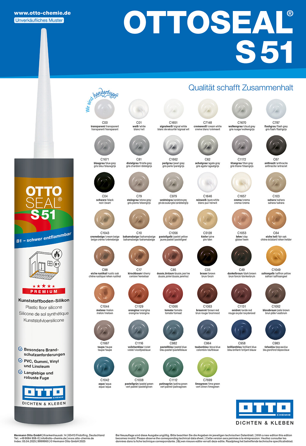 Ottoseal S 51 eignet sich hervorragend für Boden-Anschlussfugen und die spannungsausgleichende Abdichtung von Bodenbelägen aus Kunststoff, aber auch für viele andere Werkstoffe, wie Glas, Edelstahl, Aluminium, usw. Die große Farbauswahl ist an die Farben gängiger Bodenbeläge angepasst, folgt aber auch Trendfarben.