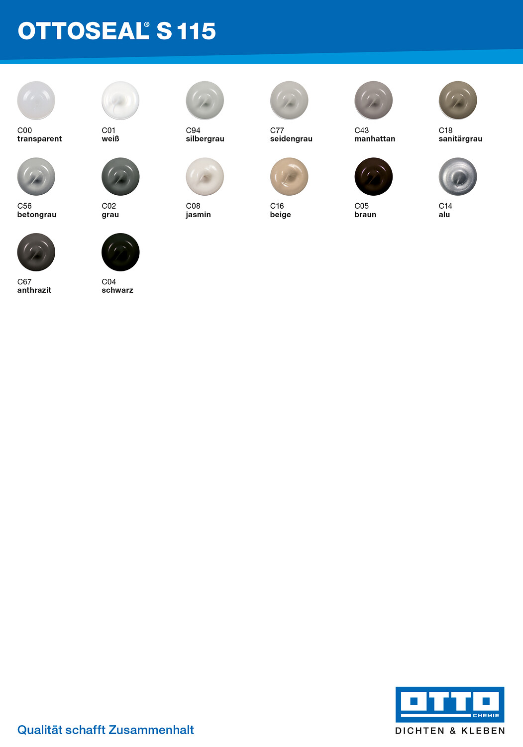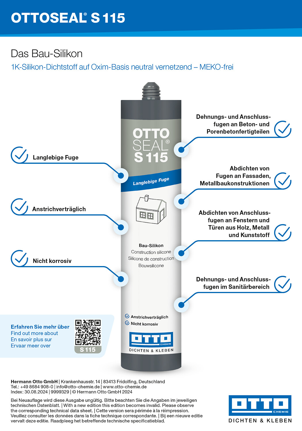 OTTOSEAL® S 115 ist das neutrale Bausilikon von OTTO für das Abdichten von Anschlussfugen an Fenstern und Türen aus Holz, Metall und Kunststoff, Dehnungs- und Anschlussfugen an Beton- und Porenbetonfertigteilen,Dehnungs- und Anschlussfugen im Sanitärbereich und das Abdichten von Fugen an Fassaden und Metallbaukonstruktionen.